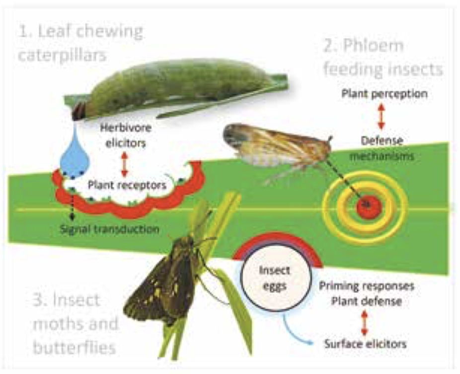 植物は植食性昆虫に対する多様な防御機構を植食性昆虫との共進化の過程で獲得しています。当研究グループでは、植物・植食性昆虫間の攻防において植物がどのようにして害虫を認識し防御機構を活性化しているのか、その分子機構の解明を進めています。また、害虫に食害された植物は揮発性物質の放出を介して、害虫に対する天敵を誘引することが知られており、この現象を利用した持続的な害虫防除法の可能性を探っています。