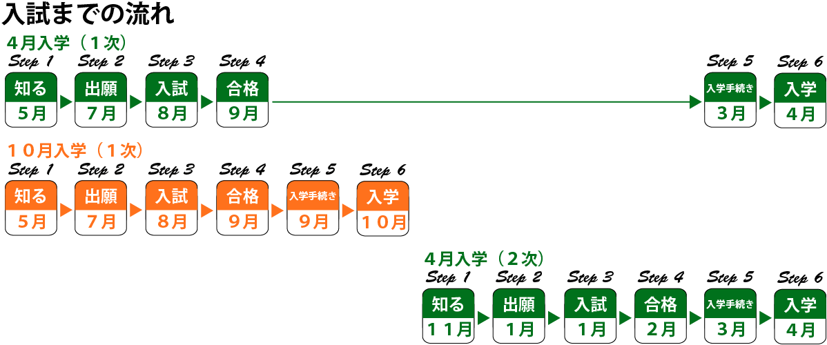 (1次:10月入学は9月中旬、4月入学は3月中旬、2次:3月中旬)