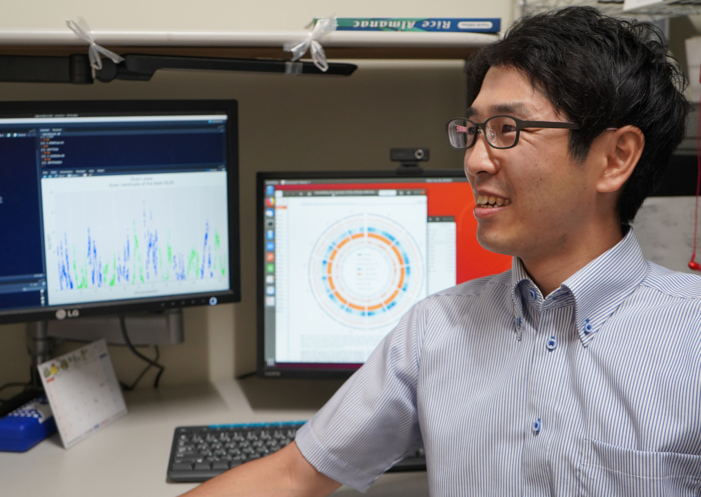 イネの遺伝育種研究をしています。私達が普段食べている栽培種(Oryza sativa)の他に、地球上には20種の野生イネが自生しています。私は、それら野生イネが持つ農業的に有用な遺伝子を探索し、育種に活用するための研究を行っています。また、近年ではコンピュターを用いたデータ解析主導のアプローチ、バイオインフォマティクスが盛んですが、私も遺伝子探索を効率よく行うための解析ツール開発も行っています。