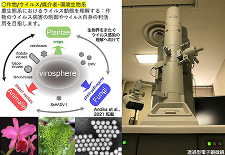 ウイルスはヒトや家畜、農作物に大きな被害を及ぼす「悪玉」の顔がよく知られています。一方で、病原菌をやっつけてくれるような我々の役に立つ「善玉」のウイルスも存在することが知られるようになってきました。さらに、自然界には膨大なウイルスが存在するのですが、私たちはまだその氷山の一角を見ているに過ぎません。そこで、私たちは農業生態系に存在するウイルスに注目して、「未知なるウイルス多様性」の理解を進め、さらに善玉と悪玉という二つのウイルスの顔を深掘りしてみたいと思っています。最終目的は、農業生態系でのウイルスの役割を紐解くことで、作物の健全な育成を図ることを目指しています。