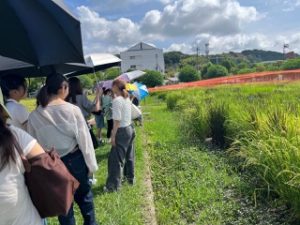 タイ王国カセサート大学と岡山大学は、交流協定を結んでおり、今年も10名の学生さんが、教員の引率で来日、岡山大学と周辺地域を見学し、さまざまな体験をしました。植物研では、馬所長の挨拶に始まり、研究所沿革や現在の研究の紹介とともに、圃場見学や、植物研図書館が所蔵する貴重図書を閲覧しました。暑い日でしたが、カセサート大学の学生さんたちは、岡大の学生さん7名と交流を深め、楽しそうに見学していました。