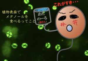 『葉っぱについてる変わり者〜微生物と植物の思いもかけない共生関係!』 植物は成長の過程でメタノールを放出しています。Methylobacterium属細菌はそのメタノールを利用でき、植物葉上で優占して植物とHappyに共生しています。植物環境微生物グループ共生細菌チーム!では、彼らの生理生態を研究し、その応用展開を考えています。彼らはメタノールがあまりにも好きすぎて、メタノール濃度の高い方へ泳いでいく走化性を示します。研究体験ではこの走化性の実験に挑戦し、そのメカニズムを理解する! |