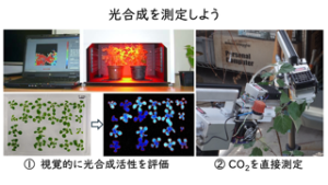 『植物の光合成を測定する』 植物が行う光合成は太陽のエネルギーを使って、取り込んだ二酸化炭素を炭水化物へと変換します。このコースでは植物が光合成に使う光エネルギーの効率を可視化する装置や植物が取り込む二酸化炭素の量を測定する装置を使って実験を行います。実験を行うときにはいろいろな創意工夫が必要なこともあります。そんな体験もできるコースです。 |