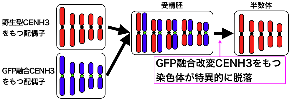 半数体は倍加半数体による育種年限の短期化に利用できますが、半数体が得られる種は限られています。シロイヌナズナやトウモロコシでは、動原体の機能を部分的に失わせた系統と野生型系統を交配すると野生型系統由来の染色体をもつ半数体ができることが報告されました。私たちはこれまでの基礎研究で得られた結果を活かし、これらの種で用いられた方法を簡便化することにより多くの種で利用可能な半数体作出系を開発しています。