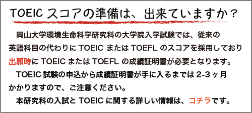 注:外国語(英語)能力は、TOEIC又はTOEFLの成績により評価します。このため出願までにTOEIC又はTOEFLを受験し、出願時にその成績証明書を提出する必要があります(有効期限は試験日の2年前から出願までの間に受験したものです)。出願日(1次:7月下旬、2次:12月上旬)までに成績証明を入手可能なTOEICテスト(1次:6月中旬、2次:11月中旬)の受験申込締切は、通常、1次:5月初旬、2次:10月初旬です。