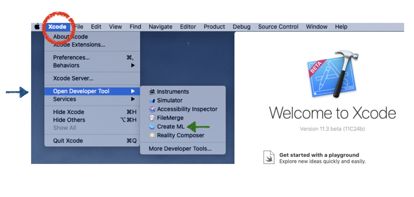 (1) X-codeを起動して“X-code”のプルダウンメニューから、“Open Developer Tool”内にある“Create ML”を選択してください。