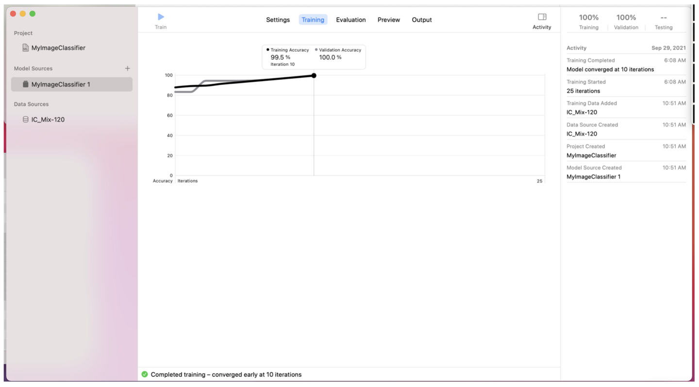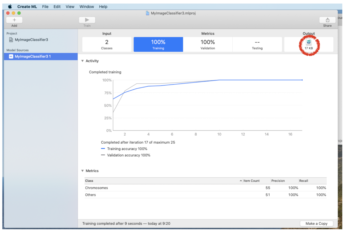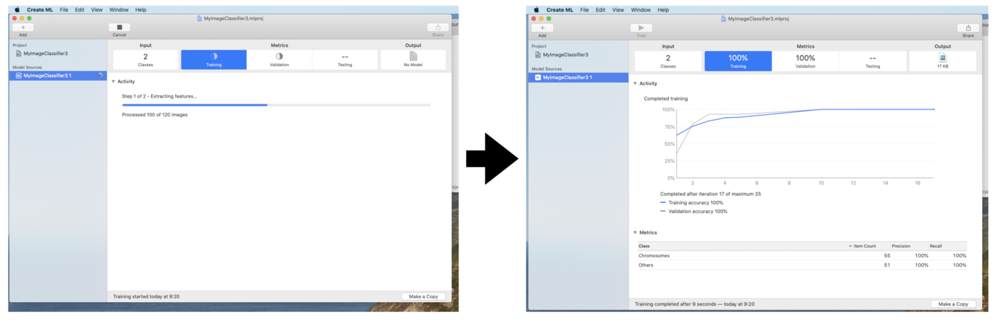 Create ML ver 3では、学習が十分と判断された時は、開始時に自動的に選ばれた”Iterations”の数より少ない反復数で終了します。生成されたモデルの判定精度は、染色体画像に関しては、Create ML ver 1で生成されたモデルのものと同程度でした。