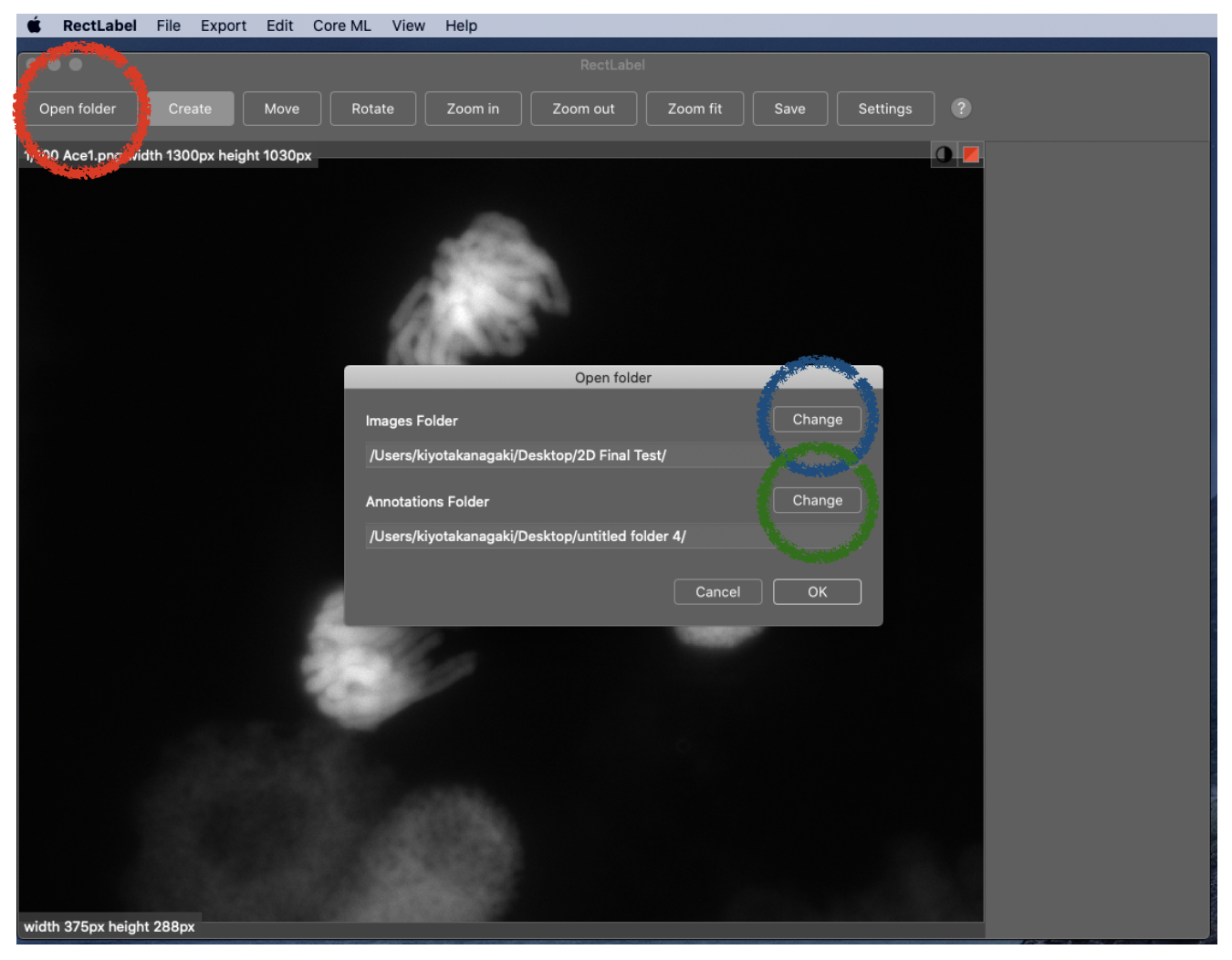 RectLabelを起動し、“Open folder”ボタンをクリックしてください。開いたウインドウ内の“Change”ボタンをクリックして、アノテーションする画像の入っているフォルダとアノテーションを保存するフォルダを選んでください。