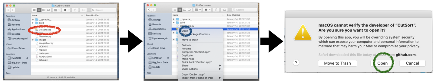 (1) ダウンロードされたCutSort-mainフォルダから“CutSort.app”右クリックによりウインドウを表示し、続いて“Open”を選択し、開いたウインドウの“Open”ボタンをクリックしてください。