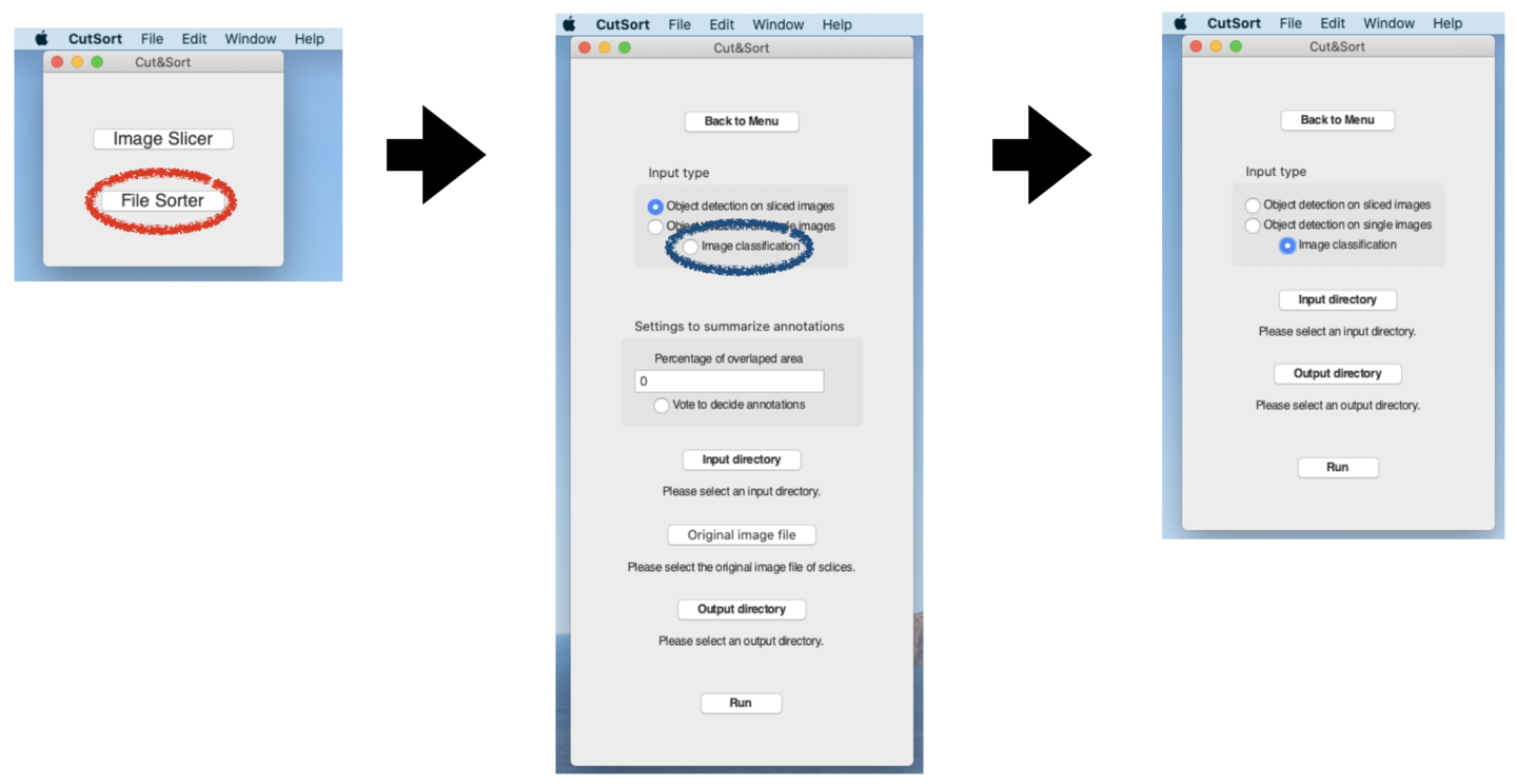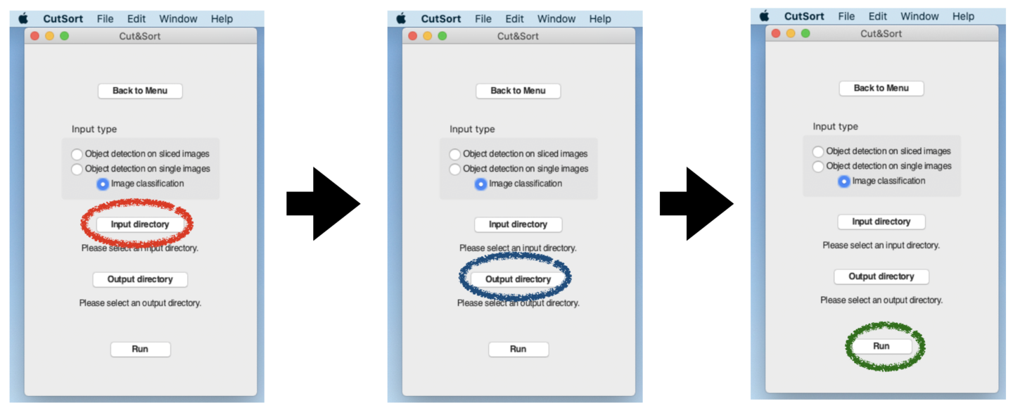 (3) RectLabelによって出力された画像と.xmlファイルを含むフォルダーを“Input directory”ボタンをクリックして選択してください。続いて、出力先のフォルダーを“Output directory”ボタンをクリックして指定してください。最後に“Run”ボタンをクリックすると画像が仕分けられます。