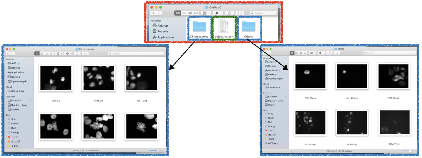 (4) 結果として、指定された出力フォルダにはクラスごとのフォルダが生成され、そのクラスに属する画像と.xmlファイルがクラスフォルダに格納されます。ファイル仕分けに関する情報が記載された“object_list.csv”ファイルも同時に生成されます。